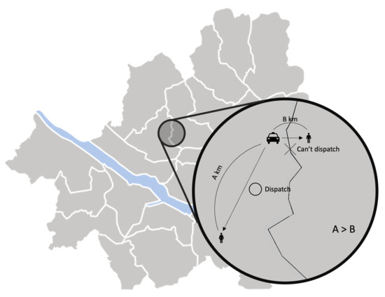 - Lee, D.H.; Wang, H.; Cheu, R.L.; Teo, S.H. Taxi dispatch system based on current demands and real-time traffic conditions. Transp. Res. Rec. 2004, 1882, 193–200. [Google Scholar] [CrossRef] [Green Version]