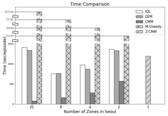 In terms of the time taken to determine the dispatch actions (Figure 13), CMM performed the best. On the other hand, M-Greedy consumed the most time—as much as 275,040 s per episode—when the number of zones was set to 25. M-Greedy mimics the farsightedness of the RL-based approaches by looking ahead to D future states. M-Greedy significantly outperforms the RL-based approaches. Compared to a basic zone-sensitive CMM algorithm, calculating the value of an action with the future states also considered was beneficial. Nevertheless, Z-CMM, with the simple removal of service area divisions, outperformed M-Greedy even without the future state considerations. The look-ahead mechanism can be introduced to Z-CMM as well. However, M-Greedy failed to finish the process of computing the top-k actions over D future states within the 30 s decision cycle. Hence, applying the excessively time-consuming look-ahead process to Z-CMM is not a viable option, as the number of cases to consider before computing the top-k cases is much higher. Even though CMM took the least time, Z-CMM remains our final recommendation as it makes full decisions safely within the time-bound and generates much higher revenue and profit.