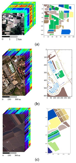Experimental data sets of hyperspectral images. (a) Hyperspectral and ground truth images of Indian Pine; (b) Hyperspectral and ground truth images over University of Pavia; (c) Hyperspectral and ground truth images of Salinas.