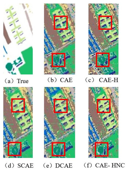 Figure 2 is the local region magnification of several different feature representation methods on the University of Pavia (UP) data set after SVM classification results, in which the training sample is 5%. As can be seen from Figure 2, SCAE method (Figure 2d), DCAE method (Figure 2e) and CAE-HNC feature representation method (Figure 2f) are superior to CAE (Figure 2b) and CAE-H method (Figure 2c) in overall classification effect. Figure 2d–f can better eliminate salt and pepper noise in classification mapping, so that the image becomes clearer and smoother. In fact, this is the result of effectively improving the phenomena of “different objects with the same spectrum” and “the same object with different spectra”. For ground objects with similar spectrum, such as grass and trees, buildings composed of gravel and bricks, there is a certain degree of misclassification. The CAE-HNC method proposed in this paper has more accurate classification results in the red area of Figure 2. The contours of trees and asphalt buildings are clearer and more in line with the real ground features.