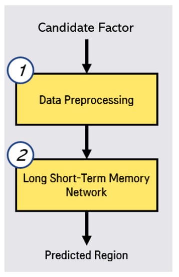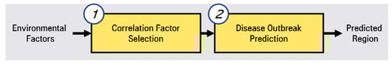 The first step is correlated factor selection for learning for the prediction model. In this correlated factor selection step, we separate irrelevant factors from environmental factors through statistical analysis. The second step is disease outbreak prediction through LSTMs (long short-term memory networks) [14,15]. In this phase of the prediction, we preprocess the selected correlated factors and predictions by using LSTMs.