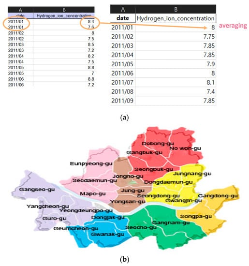 We performed the data regulation and region regulation for the monthly data as the mean of the monthly measured data, the integration for the region as living area and the correlated environment data, as shown in Figure 4. Figure 4a (left) shows the original data and Figure 4a (right) shows the mean of the monthly data. The publicly available data includes water quality measurement data that does not exist at a specific time due to problems such as the installation of measurement sensors. To solve this problem, we recombined the regions based on the living area, as shown in Figure 4b, and divided them into eight areas. Each color was arbitrarily selected as a color that could clearly distinguish the region.