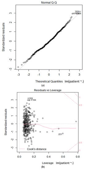 Linear model based statistical test on the relationships between hepatitis A and environmental factors (a): theoretical quantiles vs standardized residuals; (b): leverage vs standardized residuals.