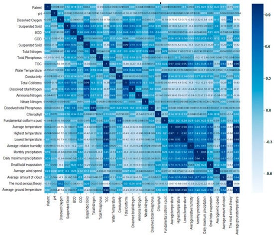 Figure 6 shows that the results of validation of correlation coefficient between environmental factors using heatmap Figure 6 shows that some environmental predictors of the model used in the regression analysis we used have low correlations with other environmental predictors in the correlation coefficient between hepatitis A and environmental factors. Therefore, it was verified that the data analysis did not show a negative effect. The 29 environmental factors used to correlate with hepatitis A patients information are hydrogen ion concentration, dissolved oxygen, BOD, COD, suspended solids, total nitrogen, total phosphorus, TOC, mercury, electrical conductivity, total coliform bacteria, dissolved total nitrogen, ammonia nitrogen, Acid nitrogen, dissolved total phosphorus, phosphate phosphorus, chlorophyll, E. coli bacteria, average temperature, maximum temperature, minimum temperature, average relative humidity, monthly precipitation, highest daily precipitation, small total evaporation, average wind speed, average cloud quantity, deep snow, average ground Temperature.