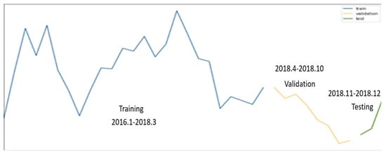 The tests were conducted in one area of Seoul, the training data used were from 2016 to March 2018, and the validation data used were from April to October 2018. To perform the predictions, the tests were conducted using data from November and December 2018. The epidemic of hepatitis A is shown in Figure 7. The blue line is the training data, the orange line is the validation data, the green line is the test data. Figure 7 visually presents the selection of training data, validation data, and test data within the time series data, including the change in the number of hepatitis A patients.