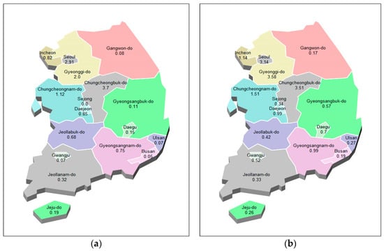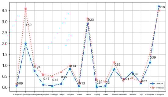 Figure 11 and Figure 12 show the national 17-area prediction of the epidemic of hepatitis A in Korea for each local government unit. We used the training data (from January 2016 to November 2018) and the test data (December 2018). The blue circle symbol is the actual data and the red star symbol is the predicted data for each area in Figure 11.