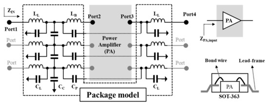 Here, CL, CP, and CC can be neglected because they have an insignificant effect on the impedance variation in the desired frequency band. As such, the package model changes the imaginary part of the amplifier’s input impedance, which will degrade the performance as the frequency increases. Figure 2 shows the S-parameter results of the package model according to frequency using the ports in Figure 1. As shown in the results, the model of the package is simulated with impedance varying up to high frequency, which can change the high-frequency response characteristics of the amplifier.
