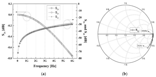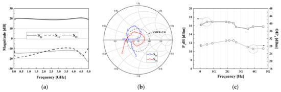 Figure 10 shows the simulation results of the designed broadband gain amplifier. The gain flatness in Figure 10a was 1.92 dB up to the 5 GHz frequency band, and S11 and S22 were matched below −9.2 dB. For the matching network, a low-pass network and a feedback technique were applied. Figure 10b shows the matching condition of input and output. Except for the low frequency of 50 MHz, the designed broadband amplifier at the desired frequency band was matched under good matching conditions near a voltage standing wave ratio (VSWR) of 2.