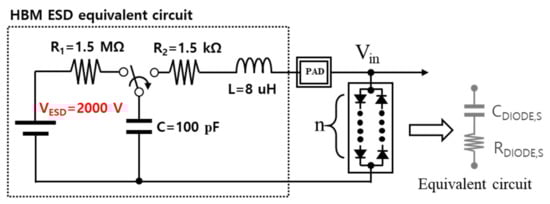 For ESD protection circuits, the stacked diode is widely used for amplifier IC. For the HBM simulation in Figure 3, the test-bench consists of a 1.5 kΩ resistor (R2), a 100-pF capacitor, and an 8 μH series inductor [15]. The current peak is typically 1.2–1.48 A for 2000 V HBM ESD stress. Here, the stacked diode protects the internal circuit by forming an instantaneous current path above the voltage of Vth × n (n is the number of the stacked diode). However, the diode model supported by the manufacturer does not include parameters for a large signal, which can cause DC convergence error in simulation, thereby lowering the accuracy of the simulation result. Therefore, in the simulation of the amplifier, it is necessary to apply the equivalent circuit model to predict the impedance variation. Here, a simple model for the stacked diode can consist of capacitance (CDiode) and resistance (RDiode).