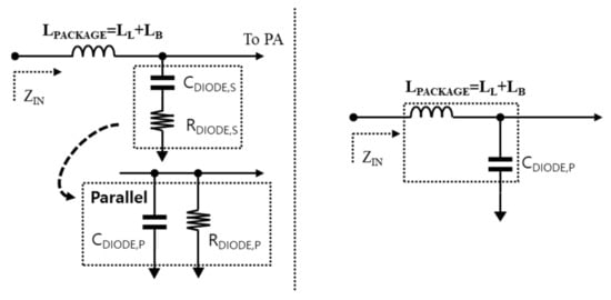 Here, Rinput_opt and Xinput_opt are assumed to be the optimal real and imaginary impedance for the amplifier, respectively. As shown in Equation (1), if the input impedance of the amplifier includes the equivalent circuit model from the package, it can be expressed as follows (2):