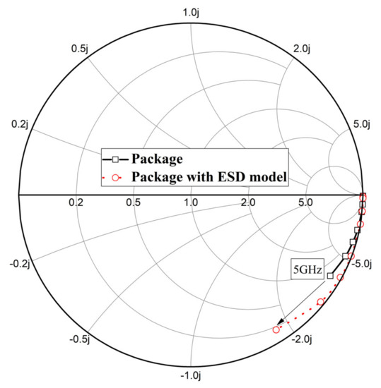 Figure 5 shows the results with and without the equivalent circuit for ESD in the package model. As such, the equivalent circuit model of the ESD-protected stacked diodes changes the impedance over high frequencies. Therefore, it must be considered when designing a broadband amplifier.