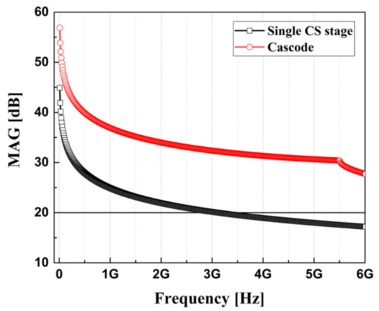 Figure 6 shows the maximum available gain (MAG) according to a single common-source and cascode structure. Here, the transistor was used using 0.5 μm GaAs E-pHEMT. The feedback method has been widely applied to broadband amplifiers because it can have flat gain and high linearity. However, the bandwidth is determined by the gain response characteristic of the amplifier itself. Therefore, the structure of the amplifier having a high gain response for broadband bandwidth is advantageous. As shown in Figure 6, for a broadband amplifier with a gain of 20 dB or more, a single common source structure cannot satisfy the performance above 3 GHz. However, the cascode structure exhibits a high gain of about 30 dB up to 6 GHz or higher, so it is suitable as a structure for feedback.
