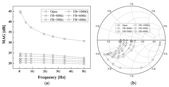 Figure 7 shows the MAG and input impedance variation according to the feedback resistance. As shown in Figure 7a, the gain of the cascode amplifier using a 500 Ω feedback resistor was more than 20 dB up to 5 GHz. Additionally, as shown in Figure 7b, the S11 of the cascode amplifier without feedback has a large impedance varying range in the desired frequency range, making it difficult to match the optimal impedance using the general narrowband matching network. However, when the feedback method is used, the impedance varying range change is relatively small, so impedance matching is possible with a general matching network.