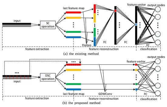 The overall structure of CNN-based method. We divide the structure into three parts: feature extraction, feature reconstruction and classification. (a) The existing methods perform SC operation in the feature extraction part, and FC layers are adopted in feature reconstruction part; (b) the proposed method performs DSC operation in the feature extraction part, and GDWConv is adopted in feature reconstruction part.