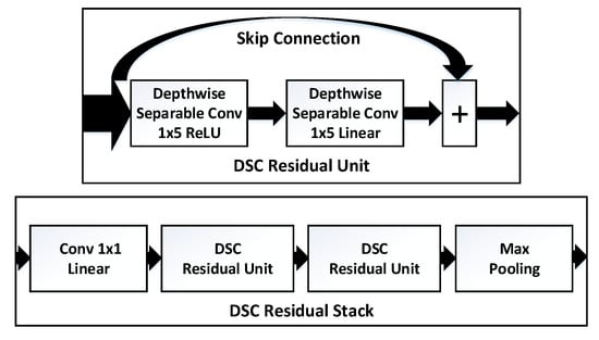 Inspired by the skip connection method of deep residual networks [1,19] that can deal with the vanishing gradient problem and improve performance effectively, in this work, we apply depthwise separable convolution (DSC) [8] rather than SC to realize residual architecture for feature extraction, which also brings the benefit of lower computational complexity. The designed DSC residual unit and DSC residual stack is shown in Figure 2. For feature extraction, multiple DSC residual stacks are used in serial and max pooling is adopted generally at the end of each residual stack for feature dimension reduction. Moreover, a linear convolution (a SC layer with convolution kernel size ) is deployed at the beginning of each DSC residual stack to perform channel (feature) fusion after max pooling from previous DSC residual stack.