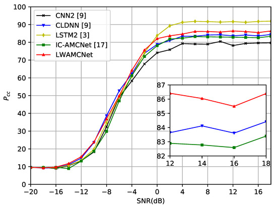 To show the robustness of the proposed method, we re-evaluate LWAMCNet using the RadioML2016.10A dataset and compare it with previous works [3,9,17]. The classification accuracy performances versus SNR is shown in Figure 4, where we see that: (1) LSTM2 network from [3] presents the highest accuracy, and it should be noted that the network input is preprocessed; and (2) LWAMCNet is slightly better than those of a simple CNN network (CNN2) [9], CLDNN [9], and the specially designed IC-AMCNet [17]. Table 10 summarizes the model complexity of these networks. The results illustrate that our LWAMCNet is still significantly ahead of other algorithms in terms of model parameters and inference time.