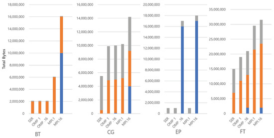 Figure 1 and Figure 2 show the three kinds of overheads in the benchmarks with a class 5 input set. Each bar measures the total bytes of declared variables to store or manage the input set at the source code level. In the graph, the 5 bars from left to right show the serial, OMP with a single thread, OMP with 16 threads, MPI with a single thread, and MPI with 16 threads configurations for each benchmark. Note that the SP benchmark is omitted because the characteristics of BT and SP benchmarks are very similar. Otherwise, each benchmark has different characteristics.