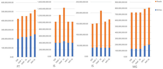 Figure 3 and Figure 4 shows the total memory references in the benchmarks with the class W input set. All memory accesses from 16 threads are accumulated in OMP and MPI with 16 threads, respectively. Interestingly, even though the MP programs tend to use more memory address space, they do not show a proportionally larger number of memory accesses. This suggests that their accesses are spread over a larger amount of memory. This makes sense as each thread has its own private address space. CG has a unique characteristic that most of the memory references are reads under the SER and OMP parallel version. Thus, the additional reads and writes on MPI are possibly used to transfer shared data between the threads. This shows the fundamental downside of MPI programming. FT has also the interesting characteristic that the large amount of additional algorithmic memory space leads to a large number of memory writes. Other benchmarks have a relatively small portion of memory writes, even though they have a large amount of algorithmic overheads, such as BT and LU. The reason is that FT performs the matrix transposition of input sets and uses the out-of-place transposition algorithm. Furthermore, in the MPI case, since the matrices are distributed to private memory address spaces, additional data movement is required prior to using all-to-all communication primitive. Thus, there are many writes that come from the data movements due to the transpositions. In most other benchmarks, the different numbers of memory accesses between SM and MP are independent of the size of memory usage. This suggests that if those accesses can be supported efficiently by the architecture, then MP programs could run as fast as—if not faster than—shared memory.