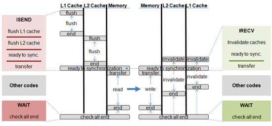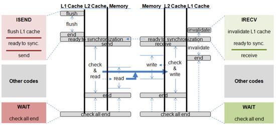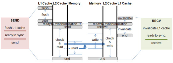 The red block on the left side presents the sequence of sub-requests that is required to be issued to each component on the send side. Requests that are separated by a bold line in the block should be issued sequentially. In other words, a request below a bold line cannot be issued until all requests above the line are completed. In the same way, the green block on the right side contains the sequence of requests that is required to issue to each component on receive side. The timing of activated components by the message passing request is drawn on the center of the figure. Vertical lines show the flow of time. On the send side, all the data to transfer have to be sequentially flushed from the highest level cache to the memory. Once the flush requests are completed, the actual transfer is initiated on the memories if the receive side also reaches the ready-for-synchronization phase. On the other hand, a message passing request on the receive side designates the address space that will be overwritten by receiving data. All of the blocks in the designated message buffer that are in the cache are invalidated, meaning that the most up-to-date version of the data will correctly be fetched from memory when requested for the first time. The invalidation requests can be simultaneously issued when receiving the message because the process does not write back data. The blocking transfer is performed only when all the sub-requests are completed.