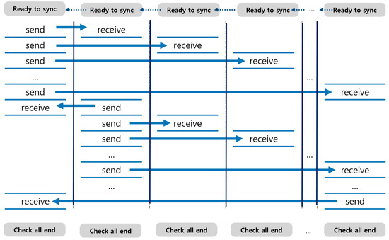 The one-to-many communication consists of multiple blocking point-to-point communications, and each blocking point-to-point communication is performed in the same manner as described in the previous subsections. Because there is no overlap between point-to-point communications, there is no additional requirement for interconnection bandwidth compared with point-to-point communication. Many-to-many collective communication is also designed in the same way. Figure 12 shows the timing of communication in all-to-all communication. The pattern of many-to-many communication can be seen as a combination of one-to-many communications.