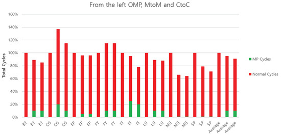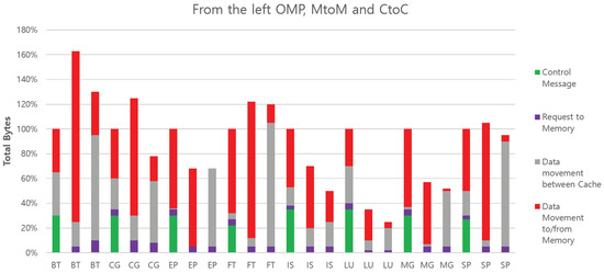 In comparison, MtoM moves more bytes on average than CtoC, and this is expected since it always moves data to memory first before copying between memory banks. However, in the case of EP and FT, MtoM is on par with CtoC. This is because the size of the problem data set of these benchmarks is relatively large compared to the size of private caches. The transferred data are finally written back to memory, even though they are copied directly from cache to cache. However, in the case of BT and CG, MtoM performs much worse than CtoC because the working data set is small in the benchmarks. In CtoC, once the working data are read initially from the memory, the data do not need to be written back to memory even in the message passing phase.
