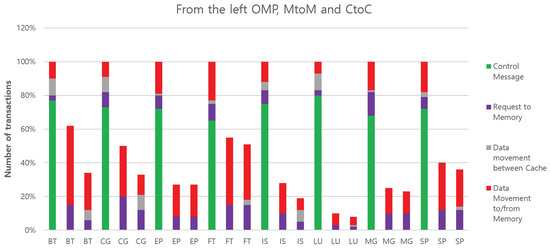 In MtoM, the transferred data always go to memory. Finally, it is interesting to note that the total amount of bytes of data moved by OMP is between those amounts required by MtoM and CtoC in CG and SP cases. For these benchmarks, SM performs better than copying between memory banks and worse than a streamlined cache copy. This is likely caused by shared data which move more times than necessary between threads, due to the fine-grained nature of block movement used in cache coherence. In these particular workloads, CtoC is able to take advantage of explicit communication to reduce sharing, and our architecture successfully capitalizes on that advantage. We also measured the total number of transactions, as shown in Figure 15.