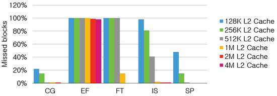 BT, LU, and MG are excluded from the figure because the percentage of missed blocks is lower than 2% even for 128K L2 caches. For those benchmarks, the performance gap between CtoC and MtoM is almost tje same for all configurations in Figure 16. However, FT and IS show a dramatic change in the number of missed blocks at 512K and 1M L2 caches. Thus, the performance gap between CtoC and MtoM becomes larger at this point for the two benchmarks.