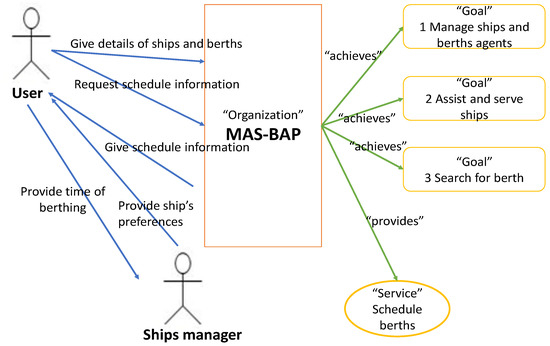 The organizational model defines the relationships between roles. According to the same definition of the official AgentTools website [30], the organizational model illustrates the interactions between the external actors and the organization. Organizational models are static and include services, protocols, goals, organizations, and actors. They have as input the derived GMoDS model. The purpose of this activity is to determine the relationships of the organization (the system) with the external actors, which may be agents, actors, or organizations. To identify the organization interfaces, several classes from external entities may be checked to decide whether the organization should communicate with them. When the organization is a sub-organization of a bigger organization, the communications between the agents in the higher-level organization and the sub-organization identify the initial communications with this secondary organization.