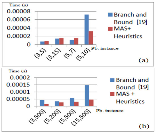 In [31], the authors introduce a Branch-and-Bound strategy relying on the computation of upper and lower bound, and a set of dominance criteria. In [32], the authors suggest a simplex and Branch-and-Bound method using the same instances. In our study, we compare our method only with the Dell’Amico results in [31] since their found results surpass those in [32] for all instances. Figure 12 illustrates the obtained results.