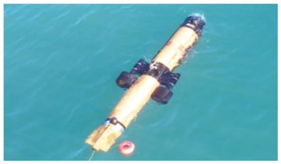 In this vehicle, three engines are mounted: two horizontal ones located at the center of the vehicle for the surge and yaw motion and a vertical one for depth control. For more details related to the vehicle’s characteristics and the obtention of model parameters, the reader is referred to Revestido Herrero [51,52].