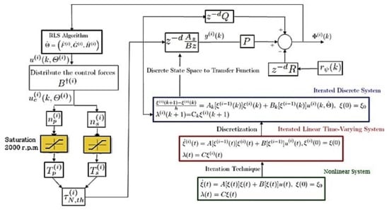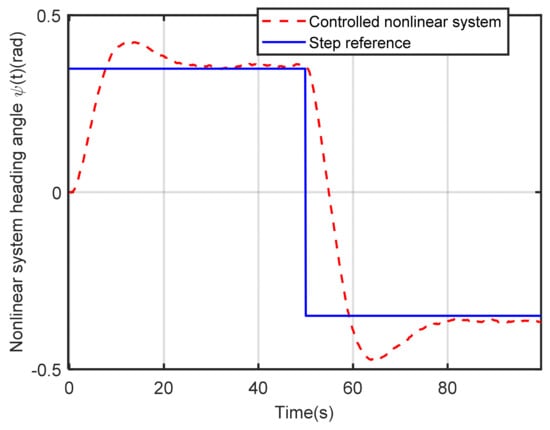 Secondly, the iteration method in Section 2 was applied to the nonlinear system and several linear time-varying (LTV) systems were generated. A minimum variance method based on a RLS algorithm was implemented in Matlab so that for each iterated LTV system, it estimates the required control parameters, Θ(i) = [f0, g0, g1, g2, h0](i). Finally, in the case here studied for the nonlinear model in Equation (5), after a few iterations, there was an evident convergence of the states’ vector towards the prescribed head angle trajectory (step function). Therefore, the last iterated control law u(i)(t, ) was applied to the original nonlinear system and it is shown how this approach is effective in controlling the heading angle to achieve the desired course-keeping trajectory.