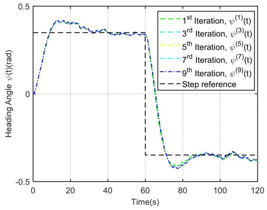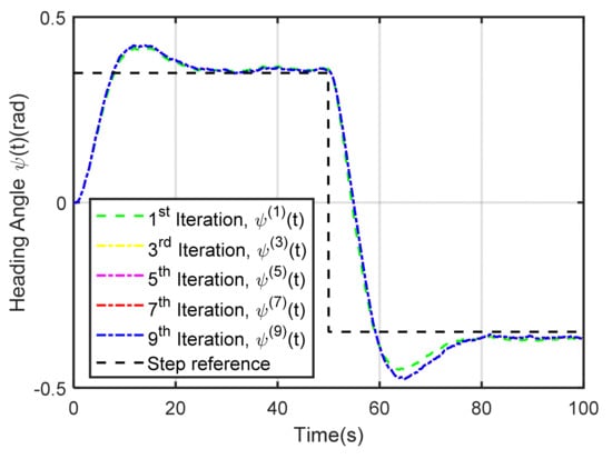 The following figures show these results for a typical course-keeping or heading control maneuver to test the performance of the proposed controller for the first scenario. Figure 3 shows the heading angle time response for various iterations, ψ(i)(t), i = (1 . . . 9), when for each of these iterations the corresponding control law u(i)(t, ) is designed by estimating the RLS parameters (i). It must be noted that the controller’s performance for a sustained zig-zag trajectory would be similar to the one shown in Figure 3. We include one change in the step input from a positive to a negative value, which is enough to show the change of course characteristics provided by the controller.