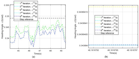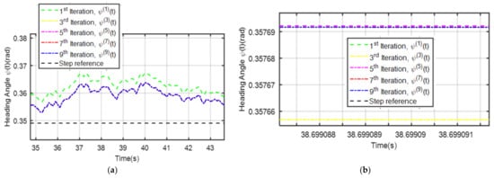 Figure 9 and Figure 10 show the results for the second scenario considered in this work under the influence of first- and second-order wave effects. The parameters of the wave model defined in Section 3.4 were tuned considering low wave effects for the operational conditions of the underwater vehicle indicated in Appendix A., in which the effects induced by waves are expected to be low. This was done by tuning the cited parameters until a magnitude of 2 degrees in yaw was obtained (see [48]). Figure 9 shows how the controller is capable of compensating for first- and second-order wave effects, since the oscillations are low and the system is able to follow the step reference, respectively. The zoomed view of Figure 10b exhibits the convergence with similar results to the first scenario. A clear convergence is seen from the fifth iteration, although the ninth was chosen in order to have a small enough error with respect to the reference signal. The results given in the first and second scenario indicate that the nonlinear adaptative control methodology with the iteration technique is robust.