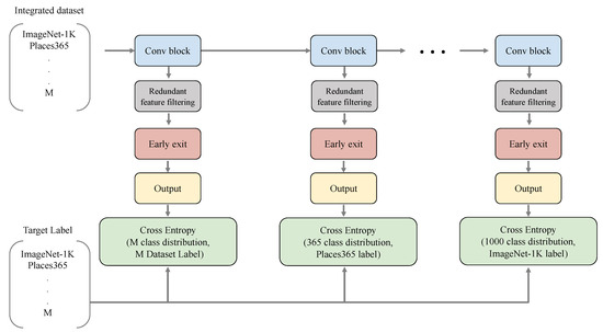 For multi-task training with multi-exit architectures, we first need to integrate the datasets. For example, to integrate ImageNet and Places365 datasets and merge them into the same mini-batch, the total quantity of these datasets, the size of images, and the number of channels must be considered. In order to match the image size and the number of channels, we fit the smaller image to the larger image size and the number of channels. One-channel images (i.e., grayscale images) are expanded to three channels and are integrated with a dataset consisting of only three RGB channels, and the smaller image size is upsampled through bilinear interpolation to fit the larger size image. In addition, small datasets were oversampled to have the same size as the largest dataset.