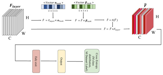 The learned features in MTL are shared and optimized with respect to multiple tasks. The advantage would be learning diverse and sharable features, and the disadvantage would be a lack of task-specific features. Therefore, our assumption is that performance can be improved by generating task-specific features through removing redundant features and inputting them into the classifier rather than naively using the shared features As found in [28], feature filtering can significantly improve the model performances. As revealed in studies [5,28,29,30], features with relatively low activation values are unnecessary or redundant features. Attention mechanisms have been proposed to use this efficiently, but it is difficult to use to remove unnecessary features because it is not performance effective in multi-exit architectures and weights according to attention values without removing features. Therefore, we propose a task-specific feature filtering method that effectively removes unnecessary features for each task-specific exit. The task-specific feature filter module shown in Figure 2 is located before the exit so as not to affect other exits, and is not located in the shared feature extractor. The redundant feature filter has trainable parameters and that have scalar values as many as the number of input channels when feature F input to each exit is input to the redundant feature filter. and sequentially perform multiplication and addition operations on the channel. The filter value obtained through this process is adjusted between 0 and 1 through the sigmoid S, and redundant features are removed by multiplying the input features.