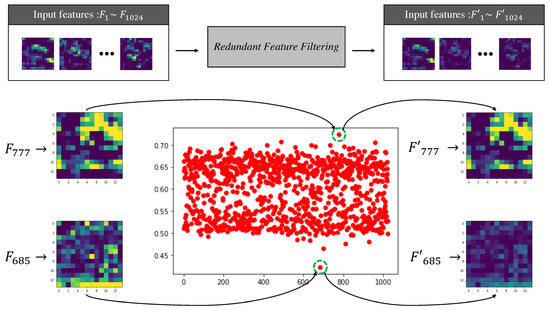 Our proposed module is trained to reduce the value of unnecessary features in task-specific features. We calculated and visualized the fixed value and value after learning exists in the module to see if the module is performing filtering of redundant features as learning progresses. The values consisting of red dots in Figure 4 come from our module when and values pass through sigmoid, and many values are distributed in 0.5 and 0.65. In other words, it can be seen that the location of an insignificant channel and the location of an important channel are classified. We visualized the features entered and the output features to see how these values change when the features generated in our model are received as inputs. It was confirmed how the 777th input channel with the highest a value and 685th input channel with the lowest value of the learned module changed when they passed through the module, respectively.