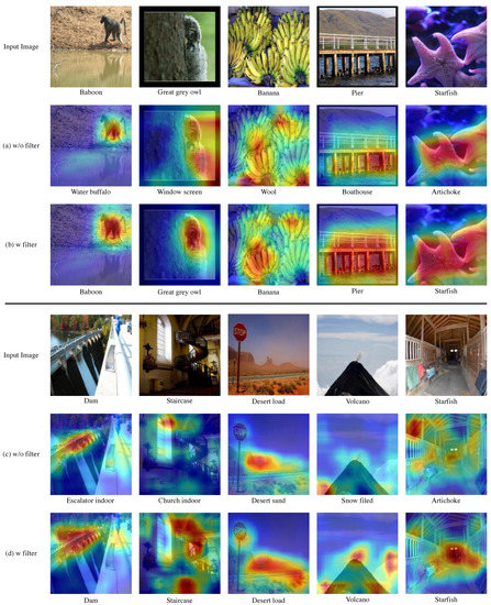 In the Place365 task, models without filtering were predicted using fewer areas. In other words, as shown in Figure 5c, the information on the background, which generally exists in the area of the image, was not fully utilized. However, in the case of our model, we were able to make more improved predictions using a wider area of the image compared to a model without filtering.