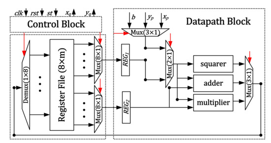 The proposed PM architecture is shown in Figure 1. It contains three blocks, i.e., (i) a register file, (ii) a control block, and (iii) a data path block. The lines in red determine the control signals generated by the control block. The , , and (start) signals are input to the proposed PM architecture. The coordinates of the final point Q are outputs. The scalar multiplier (or the secret key k, given in Algorithm 1) is also considered an input from outside the architecture (not shown in Figure 1). The implementation details of the aforementioned blocks (register file, data path, and control unit) are provided as follows: