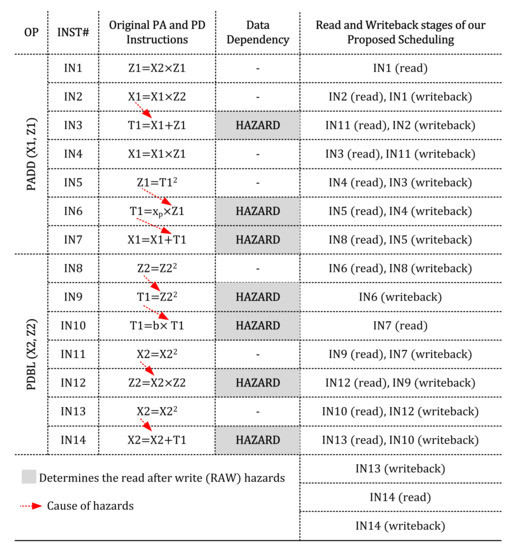 In Figure 2, OP determines the corresponding PA and PD operations. Moreover, INST# presents the total instructions (IN1 to IN14). The original PA and PD instructions in Figure 2 show the number of operations involved in and functions (these functions are briefly described in Section 2). The data dependency (also called as hazard) shows that the next instruction cannot be read (or can be termed instruction fetch) until the result of the previous instruction is written back. For example, IN3 cannot be read as it depends on the result from IN2 (depends on ). Therefore, we read IN11 instead of IN3 (shown in Figure 2). After completing the execution of IN2 (means after the writeback operation), IN3 is scheduled. We use the same strategy to schedule all fourteen (IN1 to IN14) instructions of (seven—IN1 to IN7—for PA) and (seven—IN8 to IN14—for PD) functions for the PM computation.