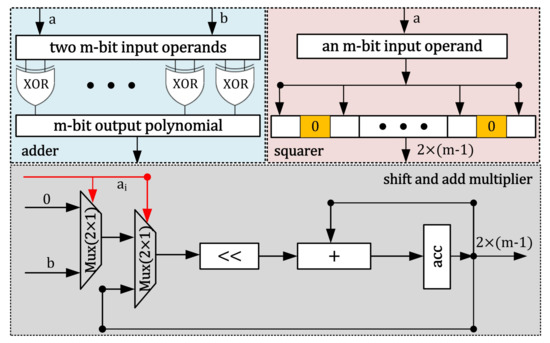 To implement the PM operation of ECC, the required arithmetic operators are adder, squarer, multiplier, and inversion (not highlighted in Figure 1). The design of the adder, squarer, and multiplier operators are given in Figure 3. Moreover, the implementation attributes of these arithmetic operators are provided in the text that follows: