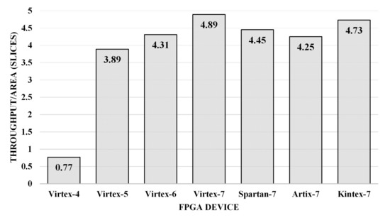 It is important to note that the higher the throughput over area ratio values are, the higher the performance of the architecture. Therefore, Figure 4 reveals that the proposed architecture results in a higher ratio of throughput over area (4.89) on Xilinx Virtex-7 FPGA. On the Virtex-4, Virtex-5, Virtex-6, Spartan-7, Artix-7, and Kintex-7 devices, the computed ratios of throughput over area are 0.77, 3.89, 4.31, 4.45, 4.25, and 4.73, respectively. There is always a tradeoff between area and throughput parameters.