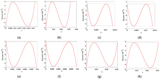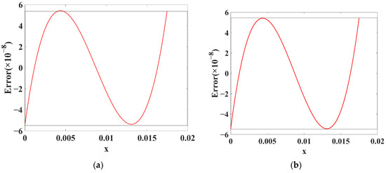 We plot the error distribution diagram of the first segment for function in Figure 1. As can be seen from Figure 1a, there are four error peaks, and the absolute values of four peaks are almost equal. However, there is still a small gap between the four peaks. Ref. [14] pointed out that p* is the minimax degree-2 approximation to function f on [a,b] if and only if there exist at least four values , , such that . Therefore, we need to make the four peaks equal. The first error peak and the last error peak are taken as the benchmark. Through the error distribution diagram, we can see that the second peak is slightly larger and the third peak is slightly smaller. Therefore, we only need to move to the right—that is, to increase c2. As shown in Figure 1b, when c2 becomes 0.501, the four peaks are equal. For other functions, we can perform the same operation to make the four error peaks in the subinterval equal, as shown in Figure 2. The fine-tuned c2 can be expressed as . The for a few common functions are shown in Table 1.