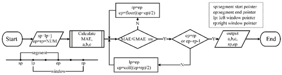 It can be seen that, after the right window is shifted to the left, the updated indexes from rp to NUM cannot be used as the end pointer ep. Then, the judgment condition of the maximum segmentation end point that satisfies the calculation precision requirements should be —that is, the previous point of rp cannot meet the requirements. Therefore, even if MAE meets the precision requirement, it still necessary to judge whether the segment width at this time is the largest according to whether ep = rp − 1 is true. If it does not satisfy the judgment, the left window lp needs to be updated to the current end pointer ep, then the end point ep moves to the right by half of and MAE is recalculated. After repeated iterations of the above calculation process, the judgment condition will finally hold and the corresponding coefficients, segment start pointer sp, and segment end pointer ep will be the outputs.