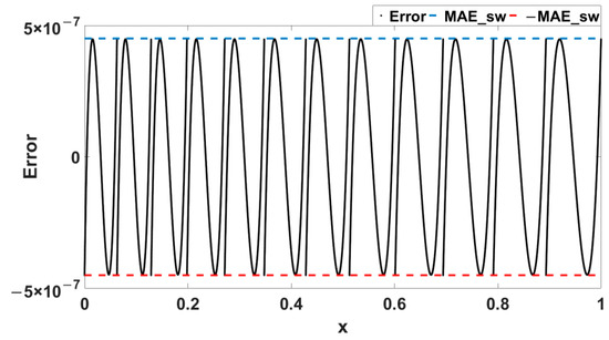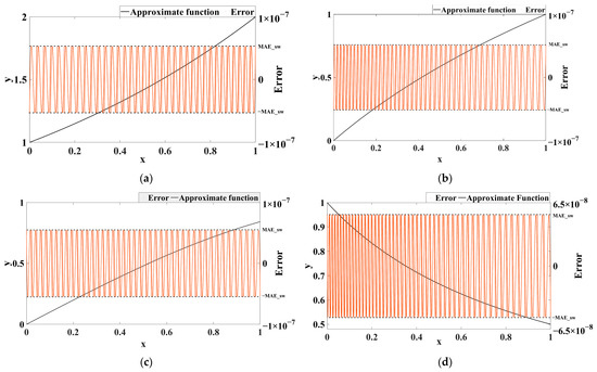 Furtherly, we set the discretization interval in Equation (2) as . For different target functions, such as , , , , we set different and plot the approximate function and error distribution in Figure 6. As is shown in Figure 6, for each segment of each function, there are four peaks whose absolute values equal . According to [14], the MAE in each segment is minimized and error flattening in the whole input range is realized.