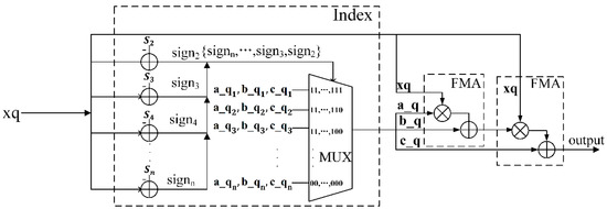 In order to solve the problem of too high a delay in the above indexing method, this paper proposes a new indexing method based on [8,9], as shown in the left side of Figure 7. For a function with n segments, the input is simultaneously compared with the starting points through (n − 1) parallel subtractors. (n − 1) subtractors calculate and output sign bits at the same time; then, (n − 1) symbol bits are concatenated into the MUX selection signals sign, and coefficients of corresponding segments are directly indexed. It is worth mentioning that the (n − 1) subtractors only have carry chains, which occupy much less area than ordinary subtractors. In addition, the proposed method has no encoder. The delay of this method is only one subtractor and an n − 1 MUX, which is lower than the existing method.