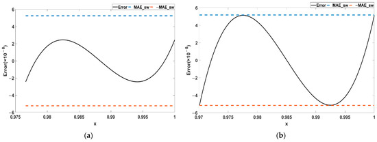 The impact of TF on the error distribution of the last segment. (a) The maximum absolute error of the last segment is not equal to MAE_sw; (b) the maximum absolute error in the last segment is equal to MAE_sw.