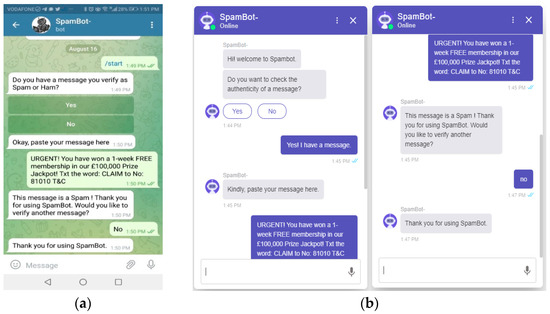 Informed consent was obtained from all the participants prior to a semi-structured interview conducted via phone calls and usability testing. In study 1: an exploratory study, open-ended questions were used during the interviews. The interviewees’ responses were probed further to make them recount their answers and make the session interactive [20]. The interviewees were informed of their right to retract their consent after conceding to take part, and their responses would be labeled as anonymous to make them express their opinions freely [21]. The Interview sessions lasted for 15 to 25 min and were recorded. Finally, the recorded audios were fully transcribed and coded. In study 2: usability testing, end-users used a Chatbot called “SpamBot”. The development of the Chatbot was informed by the analysis from the interview data obtained from victims of SE attacks. The Chatbot was developed with a deep learning algorithm developed in our previous study. The dataset used for training the Chatbot was adopted from a study by Almeida, 2011. This collection is considered a benchmark dataset in SMS Spam research. The dataset contains 747 spam messages (13.40%) and 4827 “Ham” messages (86.60%). Refer to [7] for further explanation on deep learning development. The deep learning algorithm was integrated with Telegram (a social network application) shown in Figure 1a and on a website as depicted in Figure 1b. The advantage of the Chatbot is that it can be integrated into different social media platforms that are commonly available to end users are such as WhatsApp, Facebook, etc. These platforms are often targeted by SE criminals for malicious acts. The links to the telegram and website Chatbot were provided to end-users where they are free to use any of those links. Examples of spam and non-spam messages were provided to users for testing, and they had the freedom to test other messages. Afterward, they used the Chatbot and a follow-up usability questionnaire; System Usability Scale (SUS) in Appendix A was filled for the Chatbot assessment. The SUS questionnaire is commonly used for post-test evaluation of a system that quantitatively analyses subjective arguments of the users [22].