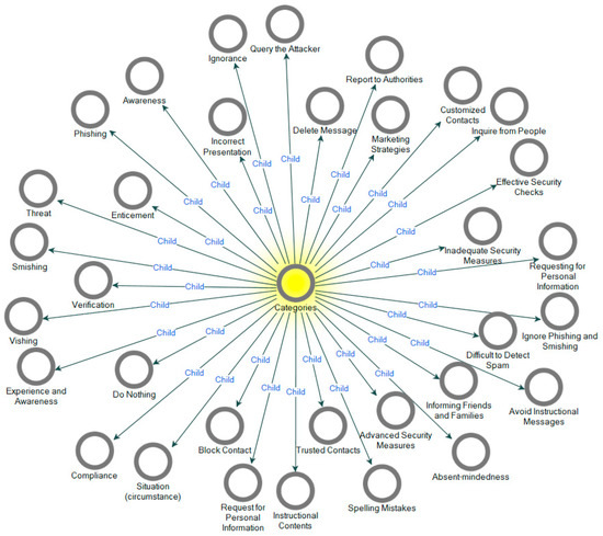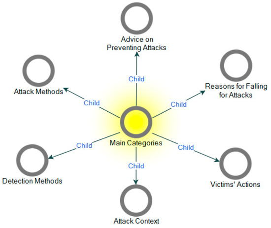 In study 1, overall, we coded the 20 transcribed interview data using open coding, and 33 free nodes depicted in Figure 2 were abstracted from the data using the Nvivo-12 tool [27]. Some of the concepts generated from the interview excerpts and abstracted free nodes (14 out of the 33 nodes) are highlighted in Table 1 for brevity purposes. In the second phase of the grounded theory: axial coding, the analysis of free nodes obtained in open coding was categorized into six main categories, and they include advice on preventing attacks, attack context, attack methods, detection methods, and reasons for falling for attacks and victims’ actions as illustrated in Figure 3. The six main categories (tree nodes) were obtained using simple logical relationships between the open codes. The phenomenon and implication of the categories obtained are highlighted in Table 2.