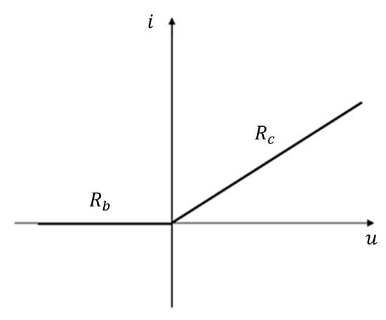 Without any loss of generality, in our illustrative examples, we chose as nonlinear load a diode with i–u dependency, linearized by two semi-straight lines, characterized by the blocking resistance Rb and the conduction resistance Rc, respectively, as shown in Figure 2. We mention that the method can easily be adapted for the exponential characteristic of the diode. Additionally, the method can be utilized for other types of current–voltage dependencies of the nonlinear loads. The method can be also used for dependent nonlinear elements, e.g., thyristors.