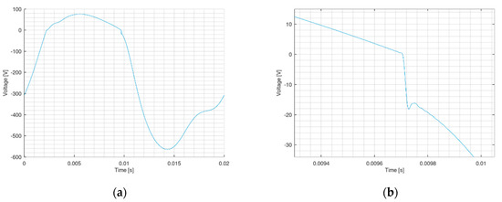 The emf voltage of the equivalent source corresponding to the nonlinear load is plotted in the time domain in Figure 6. The time-domain evolution of the voltage across the nonlinear circuit element is shown in Figure 7a. The graph, having a detailed view in Figure 7b, presents a voltage oscillation accountable to its abrupt drop—the Gibbs effect.